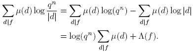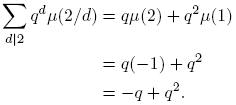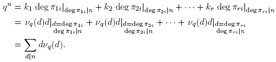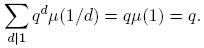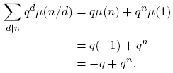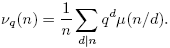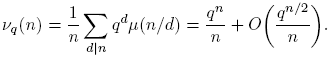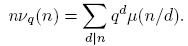 La fórmula para νq(n) se sigue de la fórmula de la inversión de Möbius (Proposición 2.10), así: tomando g(n) = qn y f(d) = dνq(d), se tiene
