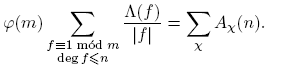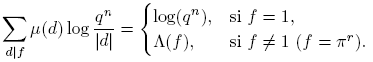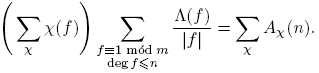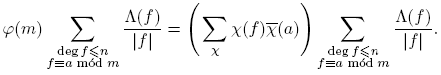Antes de proceder, introducimos un poco de notación: para p ∈ Fq[t] se define φ(p) como el cardinal del grupo de unidades de Fq[t]/(p). De aquí en adelante, π siempre denota un mónico irreducible de Fq[t], d, f siempre denotan polinomios mónicos, n siempre denota un entero no negativo. Las sumas de polinomios siempre se entiende que deben tomarse solo sobre polinomios mónicos. Con estos acuerdos, el principal resultado de este trabajo se puede expresar de la siguiente manera:
