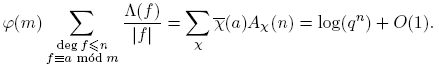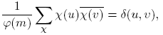 Los caracteres de Dirichlet (que están definidos en Fq[t]) inducen y están inducidos por elementos en el grupo de caracteres de (Fq[t]/(m(t)))*. Por consiguiente, hay exactamente φ(m) caracteres de Dirichlet módulo m(t). Los caracteres módulo m(t) de un grupo abeliano finito satisfacen ciertas relaciones de ortogonalidad. Aquí tomamos G = (Fq[t]/(m(t)))*. Para nosotros, estas relaciones toman las siguientes formas:
