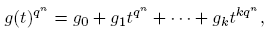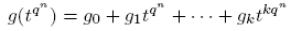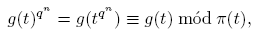 como un generador del grupo multiplicativo (Fq[t]/(π(t)))*. Entonces, dado que, tqⁿ ≡ t mód π(t), tenemos tqⁿ = t+h(t)π(t) con h(t) ∈ Fq[t]. Si g(t) = g0 + g1t + · · · + gktk, donde cada gi ∈ Fq, tenemos g(tqⁿ) ≡ g(t) mód π(t). Por otro lado,