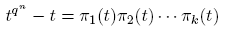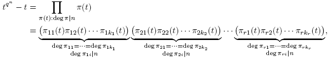 (5)la factorización única de tqⁿ − t en polinomios mónicos irreducibles. Por lo que se probó anteriormente, cada irreducible mónico de grado divisor de n debe ser o aparece como uno de los πi, y cada πi es un irreducible mónico de grado divisor de n (pues, πi| tqⁿ −t). Además, ningún πi aparece más de una vez. De esto, se deduce que