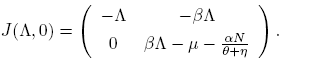 (4)It is easy to verify that model (4) admits the equilibria Ee = (0, 0) and E0 = (Λ, 0). The Jacobian matrix associated to model (4) is given by
