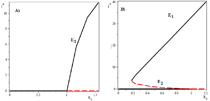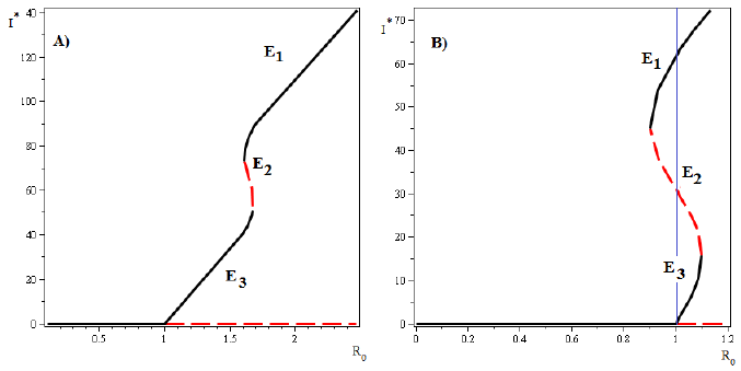 and R0 < 1, there is a saddle equilibrium point, which bifurcates into two positive equilibrium points (Backward Bifurcation on the trivial equilibrium (seeFigure 2 A))).