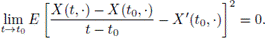 5. Mean square differentiate in I, if there exist a stochastic process X'(t, ·) (the derivative of X) such that for all t0 ∈ I we have