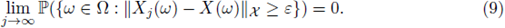 For X-valued random variables, we define the convergence in probability similarly to the real-valued case. If {Xj} is a sequence of X-valued random variable, we say that Xj converges to a X-valued random variable X in probability if for all ε > 0, we have