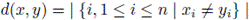 the Hamming distance from x to y is the number of coordinates in which these elements differ; i.e.: