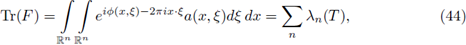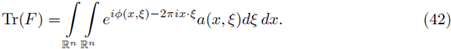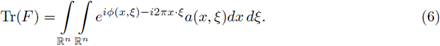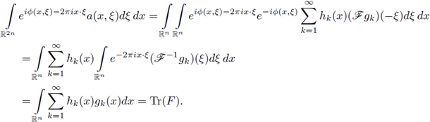 and, if r =1, n1(·) is a norm and we obtain the ideal of nuclear operators. In addition, when E = F is a Hilbert space and r = 1 the definition above agrees with that of trace class operators. For the case of Hilbert spaces H, the set of r-nuclear operators agrees with the Schatten-von Neumann class of order r (see Pietsch [40], [41]). In order to characterize the r-nuclearity of Fourier integral operators on ℝn, we will use (same as in the references mentioned above) Delgado's characterization (see [15]), for nuclear integral operators on Lebesgue spaces defined in σ-finite measure spaces, which in this case will be applied to LP(ℝn)-spaces. Consequently, we will prove that r-nuclear Fourier integral operators defined as in (1) have a nuclear trace given by