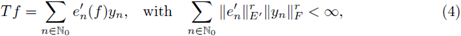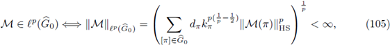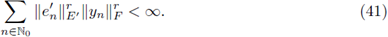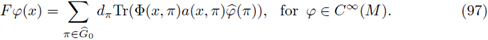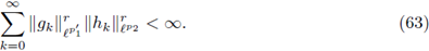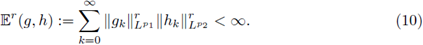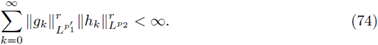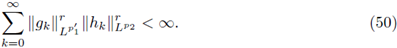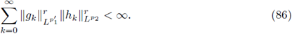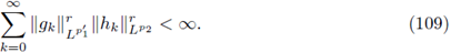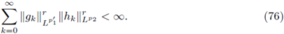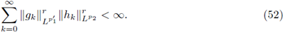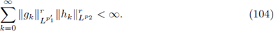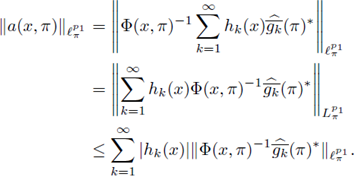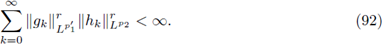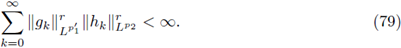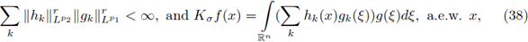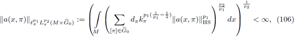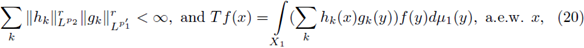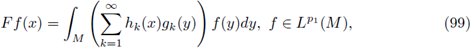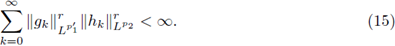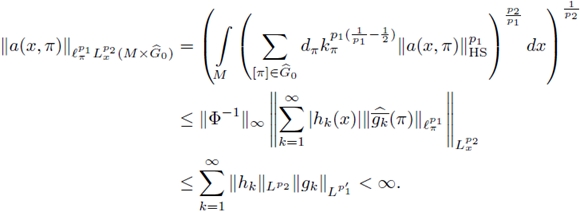 Theorem 4.2. Let us assume M = G/K be a homogeneous manifold, 0 < r ≤ 1, 1 ≤ p1, p2< ∞, and let F be a Fourier integral operator as in (97). Then, F : LP1 (M) → LP2 (M) is r-nuclear if, and only if, there exist sequences hkin LP2and gkin