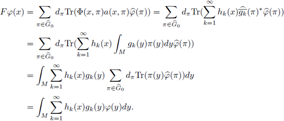 Remark 4.5. As a consequence of Delgado's theorem, if F : Lp(M) - Lp(M), M ≅ G/K, 1 ≤ p < ∞, is r-nuclear, its nuclear trace is given by