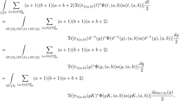 (the n-dimensional complex projective space) is a complex line through the origin in ℂn+1. For every n, ℂℙn ≅ SU(n +1)/SU(1) x SU(n). We will use the representation theory of SU(3) in order to describe the nuclear trace of Fourier integral operators on ℂℙ2 ≅ SU(3)/SU(1) x SU(2). The Lie group SU(3) (see[27]) has dimension 8, and 3 positive square roots a, 3 and p with the property