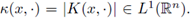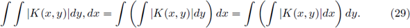 Since K ∈ L1 (ℝ2n), and the function k(x, y) := |K(x, y)| is non-negative on the product space ℝ2n, by the Fubinni theorem applied to positive functions, the L1(ℝ2n)-norm of K can be computed from iterated integrals as