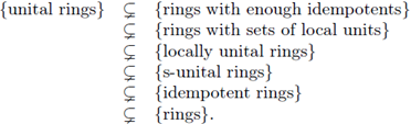 Palabras clave: Anillo unitario, anillos con suficientes idempotentes, anillos con conjuntos de unidades locales, anillo localmente unitario, anillo s-unitario, anillo idempotente.