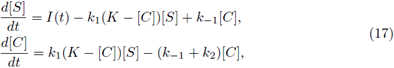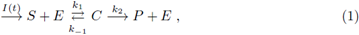 where E denotes enzyme, S denotes substrate, P denotes product and C denotes enzyme substrate complex. I(t) is the rate of input of the substrate into the system. Letting [A] denote concentration of a chemical specie A. A well-studied law of action kinetic is the law of mass action; it assumes that the rate of a reaction is proportional to the concentrations of its reactants; the law of mass action leads to the system of following non-linear reaction equations: