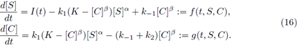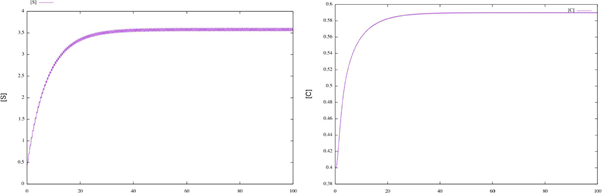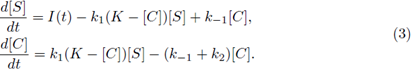All of the parameters are positive constants. Since the scheme (1) is reversible, then, by adding the second and third equations in the system (2), we have ([E] + [C])’ = 0; therefore [E] + [C] = K for all time t for some positive constant K. Using this relation, and since the last equation in system (2) decouples from the other equations, we can reduce model (2) to a two-dimensional system in terms of [S] and [C], as follows: