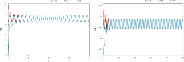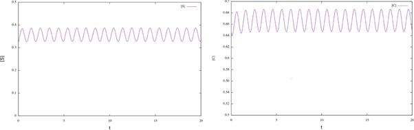 In the previous section we established analytically the existence of periodic solutions for system (2) of enzymatic reactions. The object of this section is to show numerical evidence of the existence of periodic solutions. We numerically solved these equations using a 4th order accurate Runge-Kutta integrator, which was programmed in FORTRAN 95. The graphs correspond to numerical approximations of the periodic analytic solution; the parameters are artificial, and only for the purpose of illustrating our analytical results.