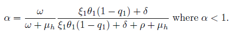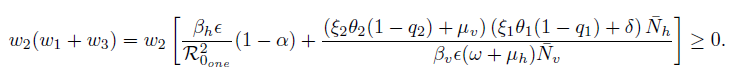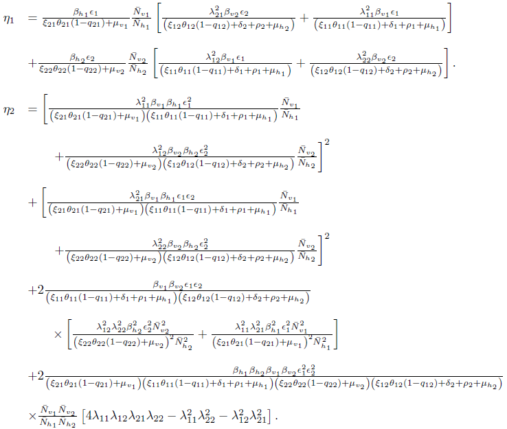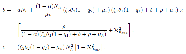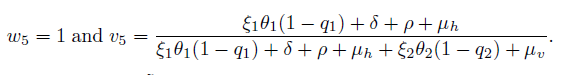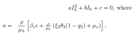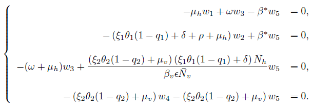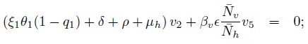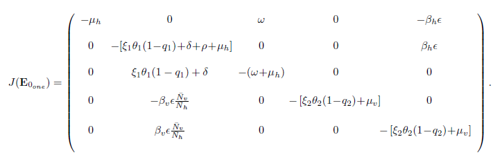 (12)It is easy to determine the eigenvalues of J(E0one ), namely: η1 = −µh, η2 = −(ω + µh) and η3 = − [ξ2θ2(1 − q2) + µv], while the others eigenvalues are given by the roots of the quadratic equation
