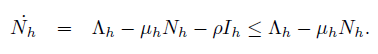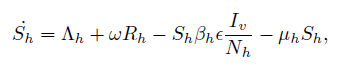 Respect to susceptible humans population, it is increasing due to recruitment at a constant rate Λh and by recovered humans from infection, which are represented by the term ωRh. Simultaneously, this population decrease due to infection by contact with infected mosquitoes through the term βhϵ