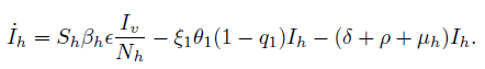 Sh(t). Now, respect to the infected humans population, it is treated with drug at a constant rate ξ1θ1, where ξ1 is the drug efficacy and θ1 is the recovery rate due to the drug. Besides, the number of infected individuals resistant to the drug (by selective pressure) is ξ1θ1q1Ih, where q1 ∈ [0, 1] represents the resistance acquisition ratio to the drug. Thus the term ξ1θ1(1−q1)Ih represents the proportion of sensitive individuals to the drug. Additionally, a proportion of infected individuals recover spontaneously at a rate δ (by action of the immune system), others die from infection at a rate ρ and others from natural death at a rate µh. thus, the equation for the variation of the infected humans population is given by