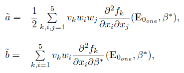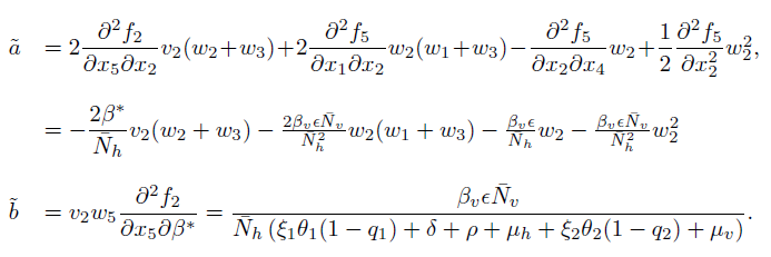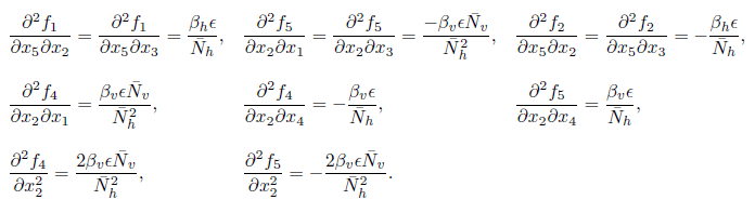 (18)can be explicitly computed as follows. Let us denote as fi , i = 1, ..., 5 to the scalar functions of the right hand of the system (3), and x1 = Sh, x2 = Ih, x3 = Rh, x4 = Sv, x5 = Iv. The coefficients wp and vp, with p = 1, 2, ...5 of (18), represent the components of the eigenvectors W and V defined on (15) and (16), respectively. After some calculations we have that the second order partial derivatives evaluated in (E0one , β∗ ) are given by