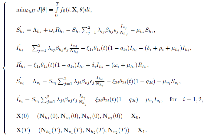 In this section an optimal control problem applied to the model (22) is formulated. Here, we are going to consider that the parameters corresponding to recovery rate due to the drug and death rate due to the insecticides θij with i,j = 1, 2 will be the controls, therefore they will be functions depending on time. The first objective will be to minimize a performance index or cost function by the use of drugs and insecticides. For this purpose, we assume that θi1 with i = 1, 2 and θj2 with j = 1, 2 are the controls by drugs and insecticides, respectively, which assume values between 0 and 1, where θij = 0 is assumed if the use of drugs (or insecticides) is ineffective and θij = 1 if the use of drugs (or insecticides) is completely effective, that is, all individuals recover with medication and all mosquitoes die with insecticides. In this sense, for i and j fixed, the control variable θij (t) provides information about amount of drug or insecticides that must be supplied at time t.