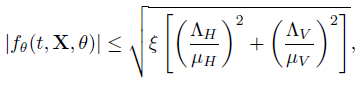 (31)where ΛH, ΛV , µH and µV are defined on (23), and fθ(t, X, θ) is the matrix obtained by differentiating the state equations of the right side of the system (29) with respect to θ, whic is given by