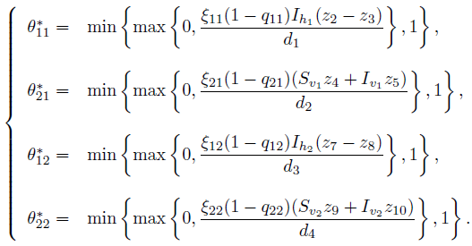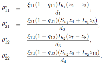 (27)where θ = (θ11, θ21, θ12, θ22) is the vector of controls, c1 and c2 represent social costs, which depend on the number of individuals with malaria and the number of mosquitoes with the parasite, and
