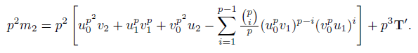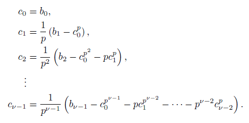 Las unidades del anillo R forman un grupo multiplicativo en el cual existe un elemento1 ξ de orden pm − 1 y que es raíz del polinomio h(x). El conjunto T = 0, 1, ξ, . . . , ξpm−2 es llamado conjunto de Teichmuller y está constituido por representantes del campo residual RF en el anillo de Galois. En [17] se demuestra que cada elemento c ∈ R tiene una única representaciónp-ádica dada por: