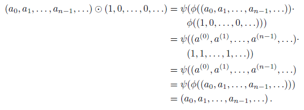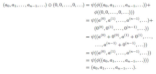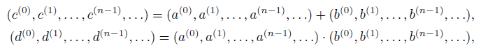 Demostración. Resulta claro que las operaciones son cerradas, veamos que los elementos neutros de las operaciones definidas en (7) son (0, 0, . . . , 0, . . .) y (1, 0, . . . , 0, . . .) respectivamente. Sea a = (a0, a1, . . . , an−1, . . .), entonces: