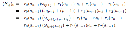 (28)Una comparación por pares de (25) con (27) y (26) con (28) respectivamente, nos permite llegar a que para cada k ∈ {0, 1, . . . , n − 1} los bloques de longitud n; Bij y Aij son iguales, de ahí que