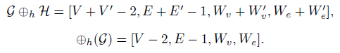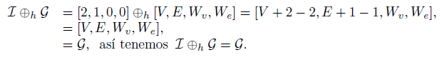 a) G ⊕hH se construye en tres etapas: (i) se elige una arista en cada grafo correspondiente; (ii) se identifican las aristas elegidas con sus vértices respectivos, uniendo así los grafos G y H; (iii) se suman los pesos de los vértices y aristas identificadas. El grafo obtenido por este proceso será denotado por G ⊕hH. Una representación gráfica de esta cirugía está en la Figura 1(a). Si esta cirugía se hace en el mismo grafo G, se escogen las aristas de forma que el nuevo grafo resultante al realizar la cirugía horizontal sea bipartito y será denotado por ⊕h(G), y cuya representación está dada por: