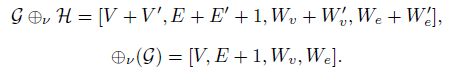 b) G ⊕νH también se construye en tres etapas: (i) se elige un vértice en cada grafo; (ii) se unen por una arista los vértices elegidos, uniendo así los grafos G y H; (iii) el peso en la arista que se creó para unir los vértices en cero y los pesos en los vértices no cambian. Finalmente, el grafo obtenido de esta forma será denotado por G ⊕νH. Si esta cirugía se hace en el mismo grafo G, se escogen los vértices de forma que el nuevo grafo resultante al realizar la cirugía vertical sea bipartito y será denotado por ⊕ν(G). Una representación gráfica de esta cirugía está en la Figura 1(b), y cuya representación está dada por: