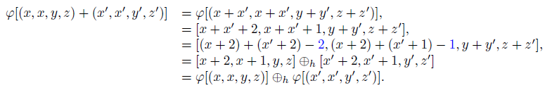 . Ahora mostremos φ[(x, x, y, z) + (x ′ , x′ , y′ , z′ )] = φ[(x, x, y, z)] ⊕h φ[(x ′ , x′ , y′ , z′ )].