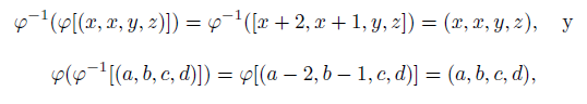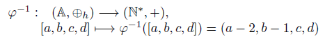 es el morfismo inverso de φ. En efecto, como a ≥ 2 , b ≥ 2, c ≥ 0 y d ≥ 0, tenemos que φ −1 ([a, b, c, d]) = (a − 2, b − 1, c, d) ∈