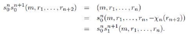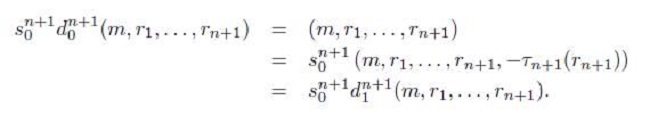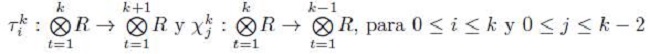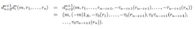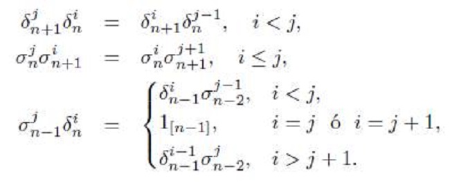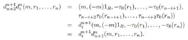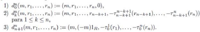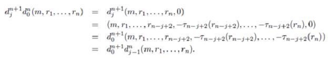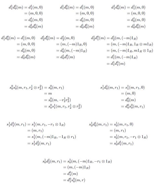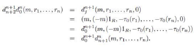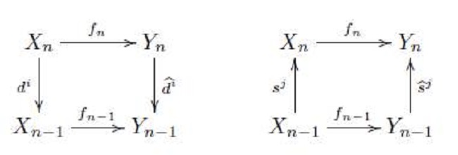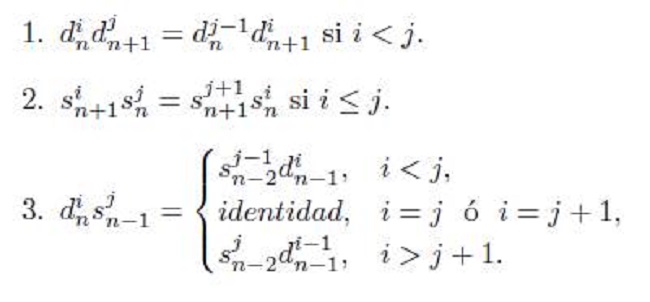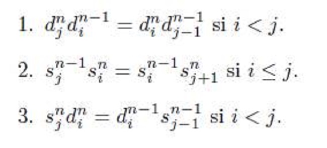 donde Xn= X([n]), din= X(δin) y sjn= X(σnj ), para X un conjunto simplicial (grupo abeliano simplicial), es decir X : Δ → Set (X : Δ → Ab) un funtor contravariante. Estas funciones (homomorfismos) satisfacen las siguientes propiedades, llamadas propiedades combinatorias: