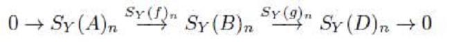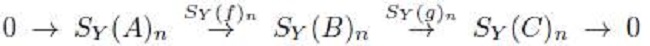En particular para objetos modelos Y : Δ → Ab sobre la categoría de los grupos abelianos, al aplicar el funtor singular S a una sucesión exacta que se descompone en Ab, es decir que satisface una de las condiciones del Teorema 2.2, se obtiene por cada nivel n ≥ 0 una sucesión exacta. Este resultado es de interés en este trabajo puesto que por medio de él se define una transformación natural necesaria para teorías de homología general la cual se presenta posteriormente en la sección 8 en la Observación 8.8.