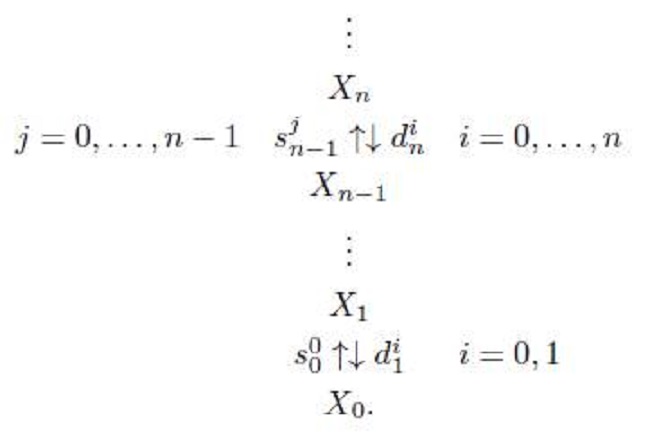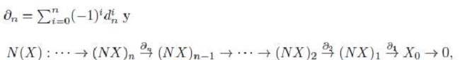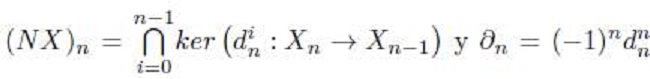. Ahora para un objeto X en Δ °Ab se tiene la sucesión {Xn}n≥0 donde cada Xn con n ≥ 0 es un grupo abeliano y también para cada n > 0 se tienen homomorfismos din: Xn → Xn-1, para i = 0,1, 2,... ,n, con esto formamos los complejos de cadenas N(X) y M(X), conocidos en la literatura como Complejo de Moore y Complejo Normalizado, respectivamente, dados por