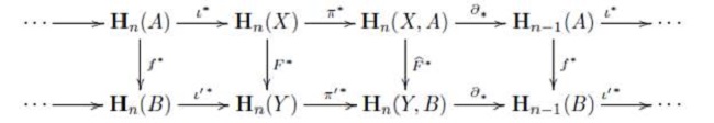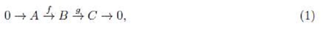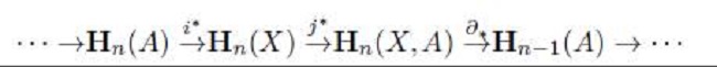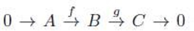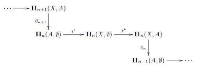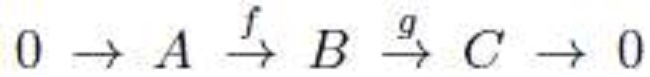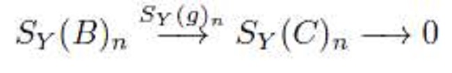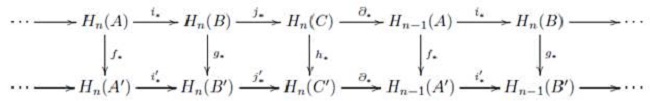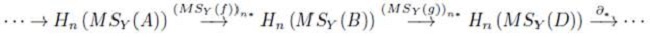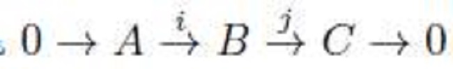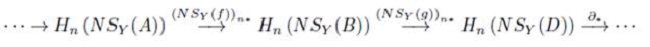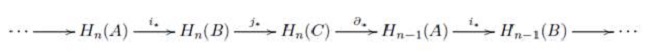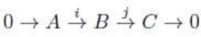 una sucesión exacta en Ch(Ab). Entonces un conjunto de homomorfismos ∂n* : Hn(C) → Hn-1(A) es definido en [1, pág. 5] como sigue: Los elementos de Hn(C) tienen la forma cn+ ∂Cn+1, donde ∂cn= 0. Puesto que jn es un epimorfismo, existe un b Є Bn tal que jn(bn) = cn. Así pues jn-1(∂bn) = ∂ (jnbn) = ∂cn= 0 y por la exactitud en la n-ésima posición existe un an-1Є An-1, para el cual in-1(an-i) = ∂bn. Por tanto definimos ∂n* (cn+ ∂Cn+1) = an-1+ ∂An. El símbolo ∂* será escrito en lugar de ∂n*