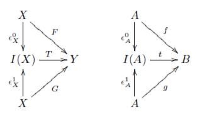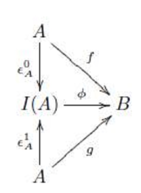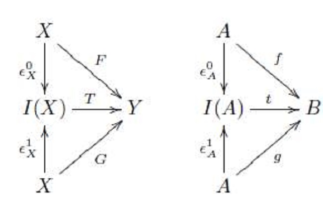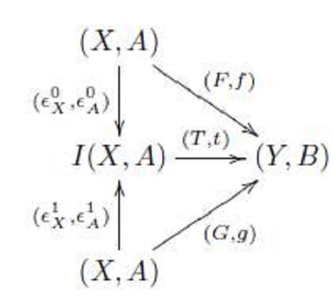 Definición 3.2. Un sistema homotópico en una categoría C, es una cuádrupla η = (I,Є0, Є1,μ) donde I : C → C es un funtor covariante, y Єi : 1c- I, μ : I → 1c son transformaciones naturales tales que μ◦ Єi = 1 para i = 0, 1, donde 1 denota la transformación idéntica 1c → 1c. Sean f,g : A → B dos morfismos en C, entonces decimos que f es η-homótopo a g (f ~η g) si existe un morfismo ∅ : I (A) → B en C tal que el siguiente diagrama conmuta