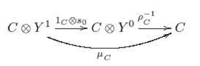 Ejemplo 3.5 (Homotopía en Categorías Monoidales). En una categoría monoidal (M, ⊗, 1) se tiene un bifuntor ⊗: M x M → M, llamado producto tensorial y un objeto identidad 1 el cual cumple que M ⊗ 1 ≅ M naturalmente para todo objeto M en M (ver [4, pág. 21]). Así pues, si se tiene un objeto modelo Y : Δ → M tal que Y0 = 1, entonces Y genera un sistema homotópico en M.