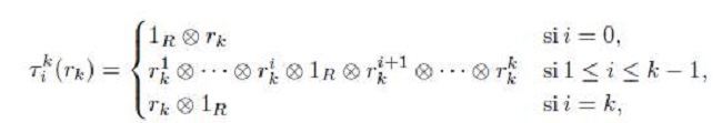 Por otro lado, consideremos la aplicación k : (X/A) x R - (X ⊗ R)/(A ⊗ R), donde k(x + A, r) = x ⊗ r + (A ⊗ R). Veamos que k está bien definida. Supongamos (x1+ A,ri) = (x2+ A,r2), entonces tenemos que x1+ A = x2+ A y r1= r2, por tanto (x1- x2) ⊗ r1+ (A ⊗ R) = 0 + (A ⊗ R), es decir x1 ⊗ r1+ (A ⊗ R) = x2 ⊗ r2+ (A ⊗ R).La función k es una función bilineal. En efecto, k((x1+ A) + (x2+ A), r) = k((x1+ x2) + A,r) = (x1+ x2) ⊗ r + (A ⊗R) = (xi ⊗r + x2 ⊗r) + (A ⊗ R) = (x1 ⊗ r +(A ⊗ R)) + (x2 ⊗ r + (A ⊗ R)) = k((xi + A),r) + k((x2 + A),r) y k(x + A,r1+ r2) = x ⊗ (r1+ r2) + (A ⊗ R) = (x ⊗ r1+ x ® r2) + (A ⊗ R) = (x ⊗ri + (A ⊗ R)) + (x ® r2 + (A ⊗R)) = k(x + A, ri) + k(x + A,r2).