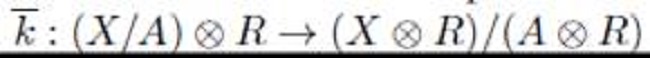 Por lo tanto k es un isomorfismo, es decir (X/A) ⊗ R ≅ (X ⊗ R)/(A ⊗ R). Entonces tenemos lo siguiente