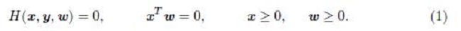 con, x0 = xn+1 = 0. Este problema es equivalente al de complementariedad horizontal, H(x, ω) = 0, xT ω = 0, x, ω ≥ 0, con H(x, ω) = F(x) - ω.