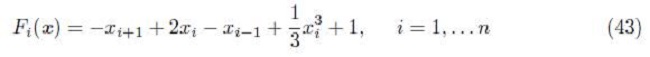Usamos el criterio de parada ||G(z)||≤ ε = 10-6 y los siguientes valores para los parámetros del algoritmo, cbig = 104, csmall = 10-4 β = 0.5 X = 10-4 Tk = t = 0.9995, y N = 200. Además, usamos gradientes conjugados cuadrados (cgs), para calcular la dirección tipo Newton inexacta en el Paso 2 del algoritmo.