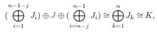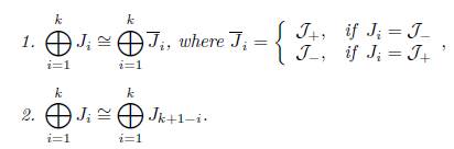 For (2), we note that the sum ⊕ki=1Ji = J1⊕J2⊕ … ⊕Jk−1 ⊕Jk is built starting from J1 which is added to J2 to obtain J1 ⊕ J2, latter we added J3 to obtain J1 ⊕ J2 ⊕ J3, and, thus, until we get the sum of J1 ⊕ J2 ⊕ … ⊕ Jk−1 and Jk to finally get J1 ⊕J2⊕ …⊕Jk−1 ⊕ Jk = ⊕ki=1Ji , but we also noted that this same sum is built as the sum of Jk and Jk−1 , and, thus, until we get to add Jk ⊕ … ⊕J2 with J1 to get Jk ⊕Jk−1 ⊕ … ⊕J2 ⊕J1 = ⊕ki=1Jk+1−i . Thus, ⊕ki=1Ji ≅ ⊕ki=1Jk+1−i .