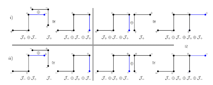 Example 3.4.InFigure 3 (i), we have the construction of J+ ⊕ J+ and J− ⊕ J−, according to the Definition 3.3, where we can see that J+ ⊕ J+ ≈ J− ⊕ J−, as graphs. Similarly, inFigure 3 (ii) we have the construction of J+ ⊕J− and J− ⊕J+, where we can see that J+ ⊕ J−⊕=J− ⊕ J+.