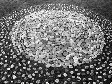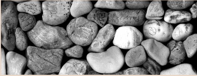 Se toma como referencia la obra de Paloma Navares "Cantos rodados de la memoria, 2003" (Figura 1) para simbolizar la piedra como objeto depositario de la presencia, la memoria y la identidad. Navares (2003) utiliza las piedras como notas enlazadas entre sí para formar un texto continuo. Para la artista, escribir sobre una piedra es un acto íntimo que rasga el tiempo, una invocación a quienes comparten recuerdos, sentimientos, temores, en cuentros y despedidas. Las piedras le permiten expresar un juego de con trarios: un contenedor (la piedra) y lo incontenible (el tiempo), lo oculto y lo visible, espacio-tiempo de ausencias y presencias en la conciencia de nuestra propia finitud, pero permanentes a través de las palabras.