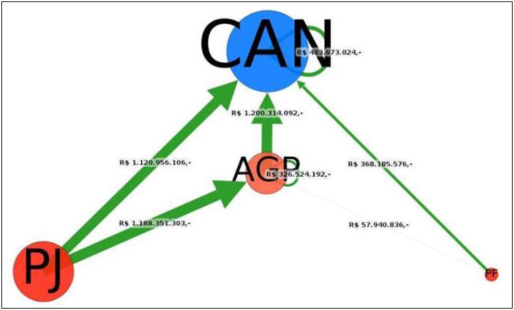 Na Figura 2, a espessura das arestas é proporcional ao montante de recursos nos fluxos7. Note-se que o peso das arestas que ligam agentes partidários a candidatos é semelhante ao peso das arestas que ligam pessoas jurídicas aos partidos. Por sua vez, as transferências entre agremiações partidárias entre si (loops) e de candidatos entre si (loops) revelam a dimensão estratégica de busca de aliados no pleito eleitoral, o que acontece também nas transferências das agremiações partidárias diretamente para os candidatos.