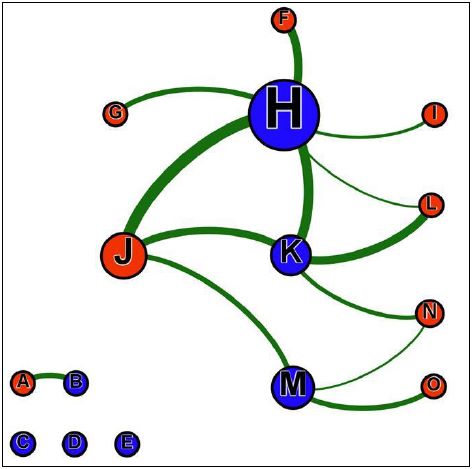 Em redes com elevado número de nós, é comum um dos componentes, chamado de gigante, ser formado pela maioria, ou mesmo a quase totalidade, dos nós. Os nós entre F e O, na Figura 3, formam um conjunto desse tipo. Os demais componentes, ou sub-redes – em geral constituídos por apenas um nó (casos de C, D e E), por díades (A-B) ou tríades e eventualmente por quatro ou mais nós –, são chamados de componentes isolados (Newman, 2010; Batagelj, 2011).