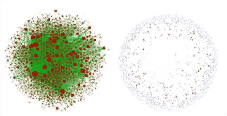 A rede de financiamento eleitoral de 2010 é formada por um componente gigante que congrega mais de 90% dos nós da rede e também por milhares de pequenos componentes isolados. A partir da rede geral (Figura 1), foram extraídos dois grafos, integralmente complementares (Figura 4), que representam o componente gigante e os 7.273 componentes isolados: