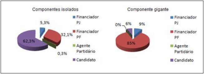 Apenas 969 componentes isolados apresentam alguma conexão. Contendo 5.386 nós, esse conjunto resulta em média inferior a seis agentes/nós por componente. Trata-se de pequenos grupos políticos desconectados entre si, como, por exemplo, partidos de pequeno porte e seus candidatos com um reduzido número de financiadores.